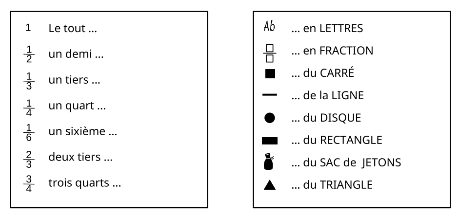 Peut s’utiliser mode jeu des 7 familles (« dans la famille tiers, je voudrais le tiers du disque ou le tiers du triangle »…ou « dans la famille du rectangle, je voudrais le quart du rectangle ») ou encore pour des jeux du type Halli Galli….