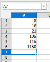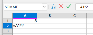 Comme exemple, on choisit le plus connu des tableurs libres : Calc, qui fait partie de la suite Libre Office. Pour y mettre un programme de calcul, on commence par entrer un nombre (qui sera modifié plus tard) en A1, puis on écrit en A2 la formule =A1*2 :
