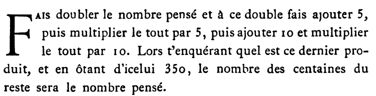 Depuis les années 1980, Yves Chevallard propose d’entrer dans l’algèbre par le biais de programmes de calcul, et ce, dès le premier degré. On verra plus bas que les programmes de calcul peuvent être vus comme une généralisant les problèmes de changement d’état dans la classification de Gérard Vergnaud. Traditionnellement, on les présente comme des tours de magie, comme le faisait Claude Gaspard Bachet de Méziriac au début du XVIIe siècle :