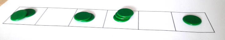 Avec du matériel disponible en grande quantité, on peut faire jouer toute une classe de CP (voire après !) : pour une classe de 24 élèves, il faut une centaine de jetons (ou graines ou billes ou cartes etc.) et 12 plateaux de jeu (dessin d’une grille sur une feuille A4) comme par exemple celui-ci, dessiné au tableur (les élèves peuvent aussi vouloir dessiner eux-mêmes la grille) :
