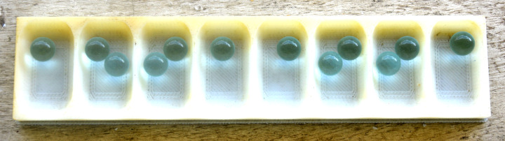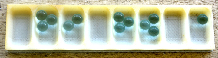 On peut aussi, comme dans la région des grands lacs, creuser des trous alignés dans le sol et jouer avec des graines, ou utiliser seule la moitié d’un plateau d’awalé avec des graines ou des billes (ici, des graines de haricot que les enfants n’aiment pas et ne risquent pas trop de mettre dans la bouche) :