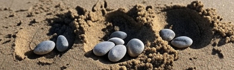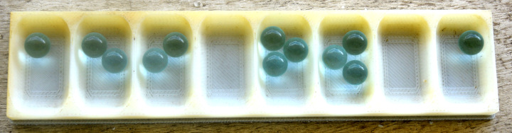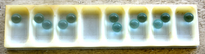 On peut aussi utiliser de la craie pour dessiner une grille de cases (comme la marelle, mais avec seulement un alignement de cases) et jouer avec des billes posées dans les cases :