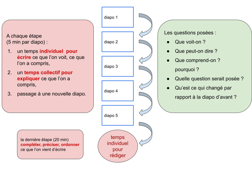 Son déroulé : l’activité est décomposée en cinq diapositives, élément par élément. Chaque étape accorde un temps individuel court (5 minutes) pour écrire ce que l’on voit, ce que l’on a compris, puis un temps collectif pour expliquer ce que l’on a compris.