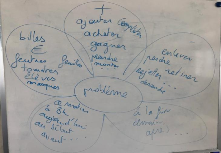 Cet enseignement d’enrichissement et de structuration du vocabulaire devient un outil de raisonnement pour entrer dans les énoncés des problèmes. L’objectif, comprendre le choix de l’opération – véritable enjeu de la résolution – lié à l’identification des relations entre les données dont les relations ne sont pas explicitées par le texte.