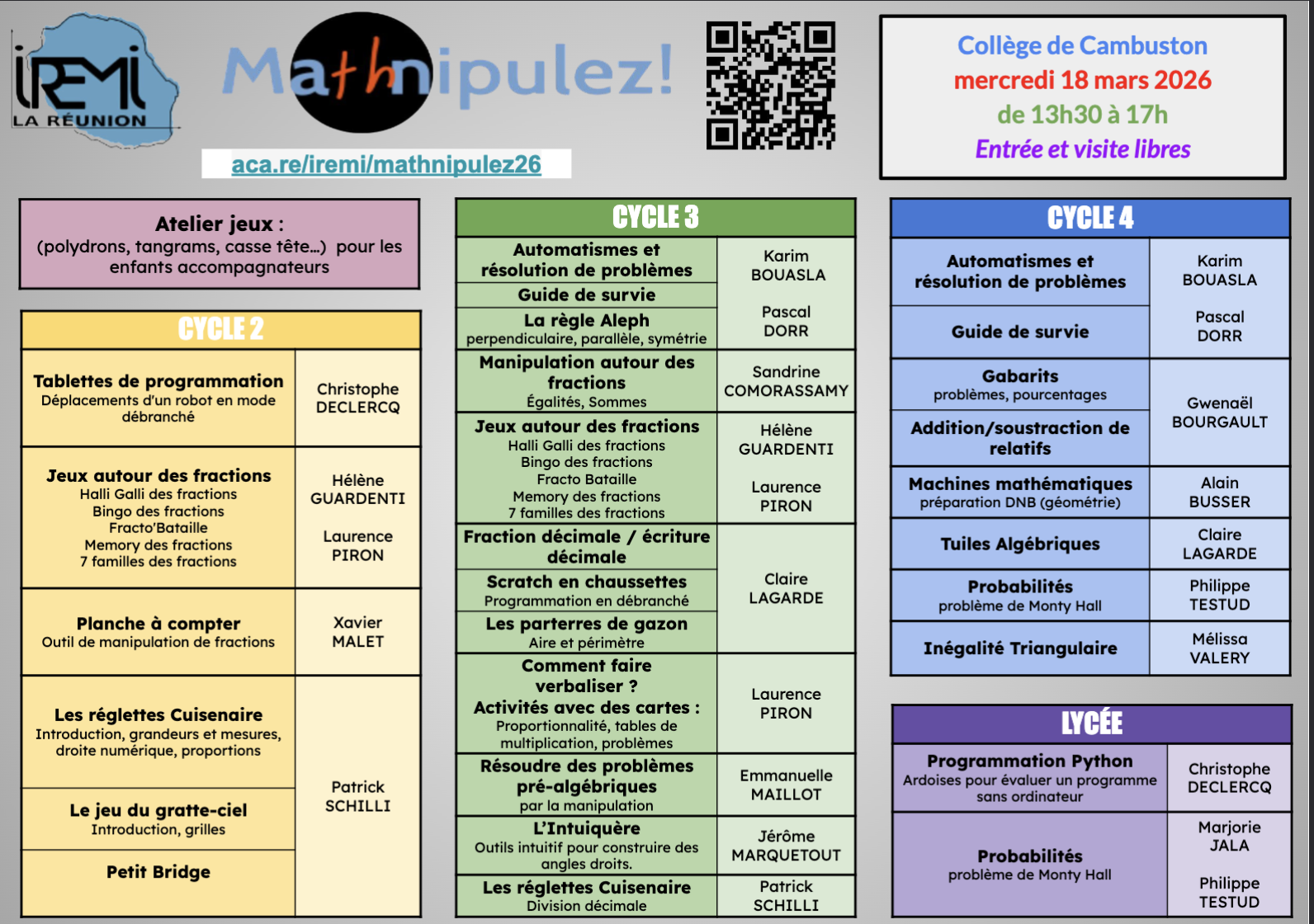 La 4ème édition du Forum Ma(th)nipulez 2026 se tiendra le mercredi 18 mars 2026 (après-midi) au collège de CAMBUSTON (Saint ANDRÉ).
