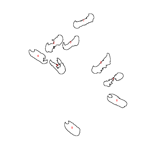 ImageJ compte 9 composantes connexes, donc 9 graines dans l’image. Elles peuvent être numérotées :