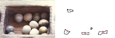 Très bien : l’ordinateur sait compter au moins jusqu’à 9. Sauf que la suite d’opérations précédentes n’est pas automatisable (dans un script), notamment parce que le choix du seuil a été fait manuellement, et il n’est pas facile de déléguer ce choix à un algorithme. Par exemple, avec la nyumba qui ouvre cet article, on voit que seules quelques ombres (et aucune graine, celles-ci sont trop claires) ont été comptées :