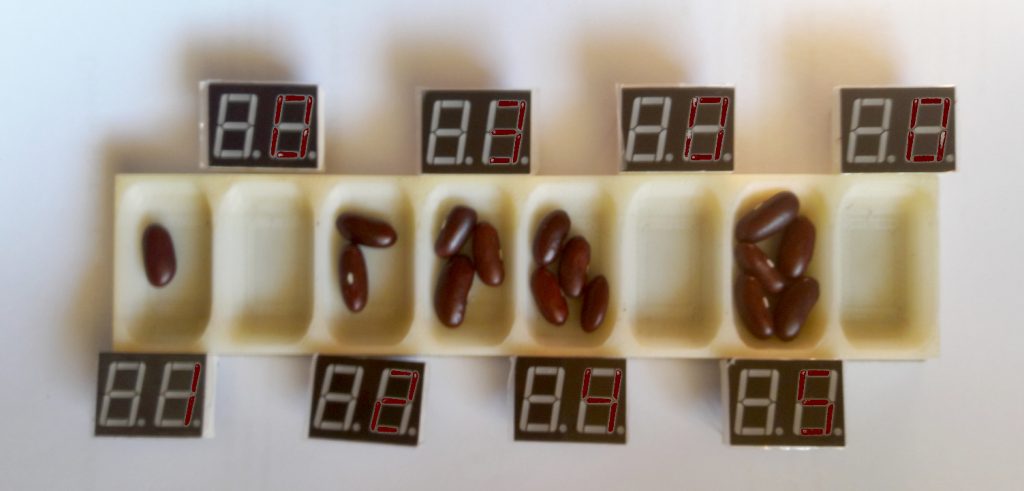 Le module ESP-32 peut être programmé en micropython. Le plateau serait plus pédagogique si les chiffres étaient affichés en calligraphie : ce sont les formes que les enfants doivent apprendre à reconnaître.